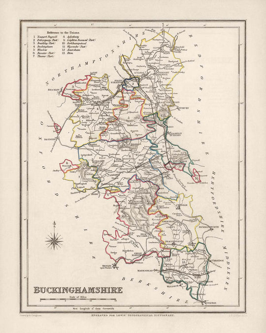 The Old Map of Buckinghamshire by Samuel Lewis, 1844 captures the essence of a bygone era, allowing you to explore the county's historical landscape and immerse yourself in its rich heritage.