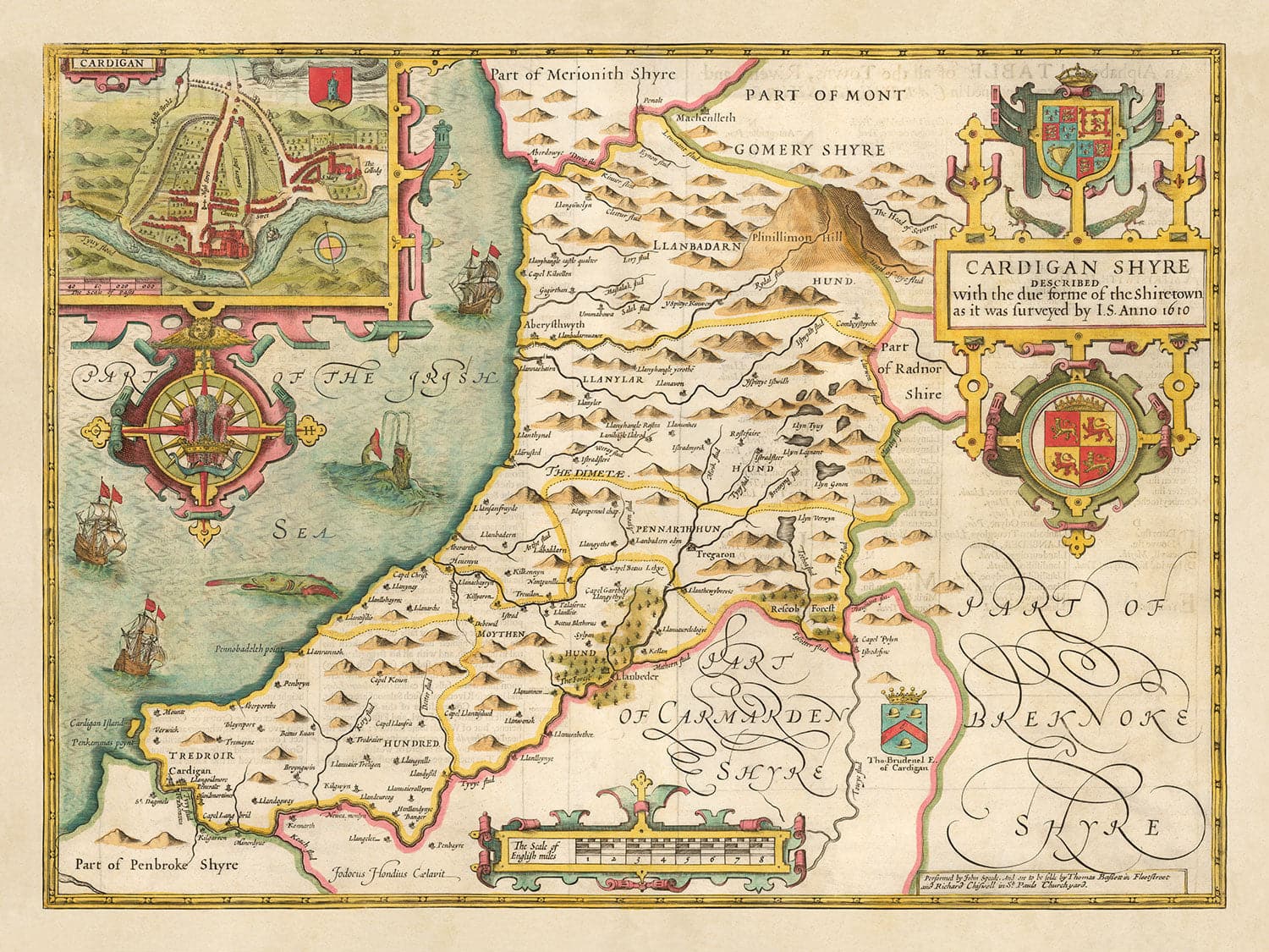 This old, full colour and exceedingly rare map shows the ancient county of Cardiganshire (now Ceredigion), Wales in 1611. It was created by John Speed and engraved by Jodocus Hondius, and originally published in Speed's "The Theatre of the Empire of Great Britaine".