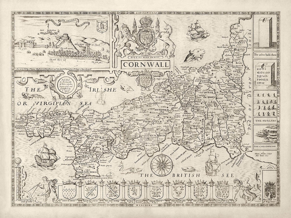 This old black and white/monochrome wonderful and exceedingly rare map shows the ancient county of Cornwall as it was in 1611. It was created by John Speed and engraved by Jodocus Hondius, and originally published in Speed's "The Theatre of the Empire of Great Britaine". The coat of arms of the Monarch of the United Kingdom appears in the top centre, along with the Monarch's motto Dieu et mon droit - God and my right.