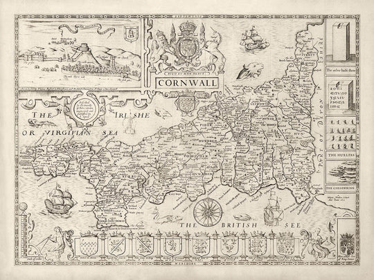 Many of the towns, villages and cities in Cornwall are already visible in this map. Curiously, an inset engraving in the top left of Launceston suggests that this town was the capital of Cornwall back then. Cornwall itself has a different shape, too - we now know that the southwest peninsula is a lot further south.