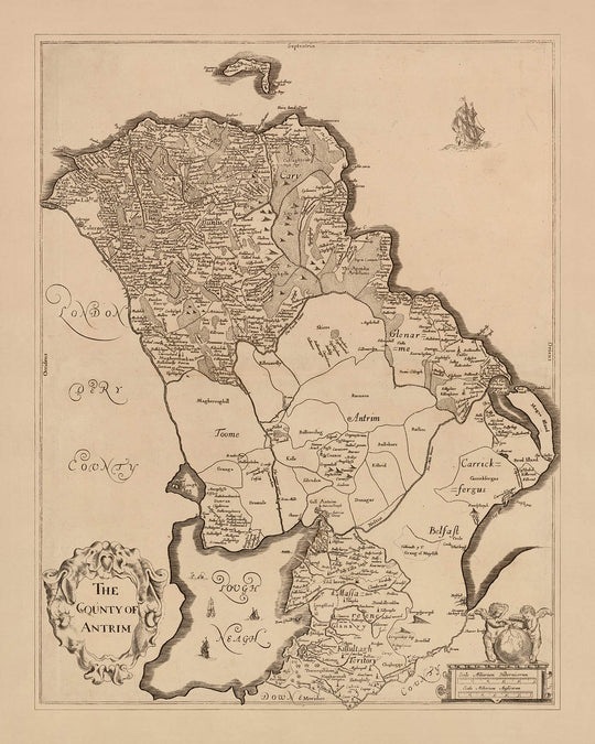 This map of County Antrim, originally published in 1685 by Sir William Petty, provides a detailed and fascinating glimpse into the history and geography of this region of Ireland. Petty's map is based on the Down Survey of Ireland, the first detailed land survey on a national scale anywhere in the world. The survey was undertaken from 1656 to 1658 to measure lands that were to be taken from Irish Catholic landowners and given to English Protestants.