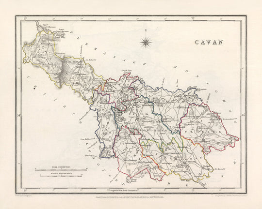 This exquisite old map of County Cavan, Ireland, created by Samuel Lewis in 1844, offers a captivating glimpse into the historical landscape of this region. With its intricate details and elegant cartographic style, this map is a true collector's item for history enthusiasts and map aficionados alike.