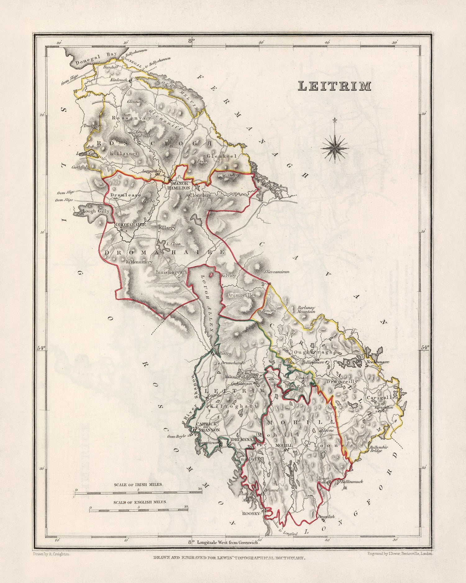 Old Map of County Leitrim by Samuel Lewis, 1844: Carrick-on-Shannon, Manorhamilton, Drumshanbo, Dromahair, Lough Allen