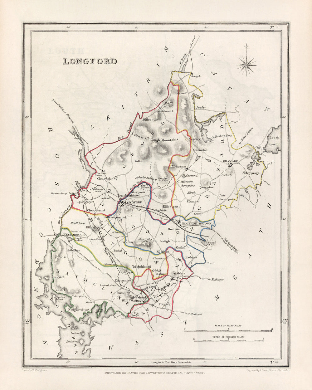 Old Map of County Longford by Samuel Lewis, 1844: Ballymahon, Edgeworthstown, Granard, Abbeyshrule, River Shannon