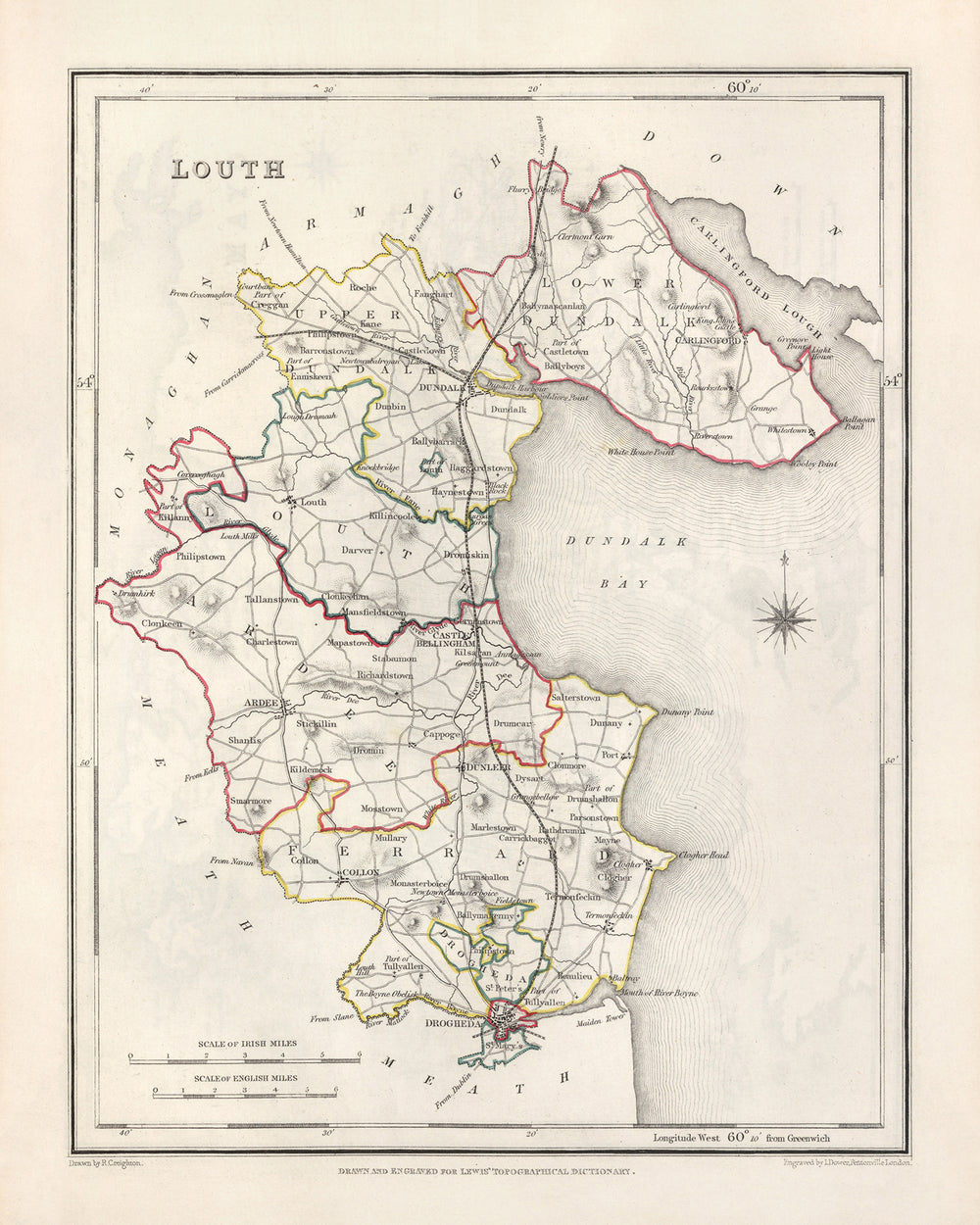 Old Map of County Louth by Samuel Lewis, 1844: Dundalk, Drogheda, Ardee, Carlingford, Cooley Peninsula