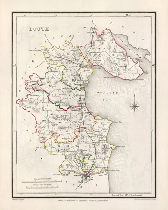 Immerse yourself in the rich history and captivating beauty of County Louth with the Old Map of Louth by Samuel Lewis, 1844. This meticulously crafted map offers a window into the past, allowing you to explore the historical landscape and trace the footsteps of those who came before.