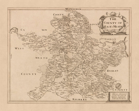 This map of County Meath, then County East Meath, originally published in 1685 by Sir William Petty, is a detailed political and physical map that provides a wealth of information about the county and its surroundings. The map is based on the Down Survey of Ireland, which was the first ever detailed land survey on a national scale anywhere in the world. Petty's map is a reduced scale version of the original Down Survey, but it still manages to capture an impressive amount of detail.