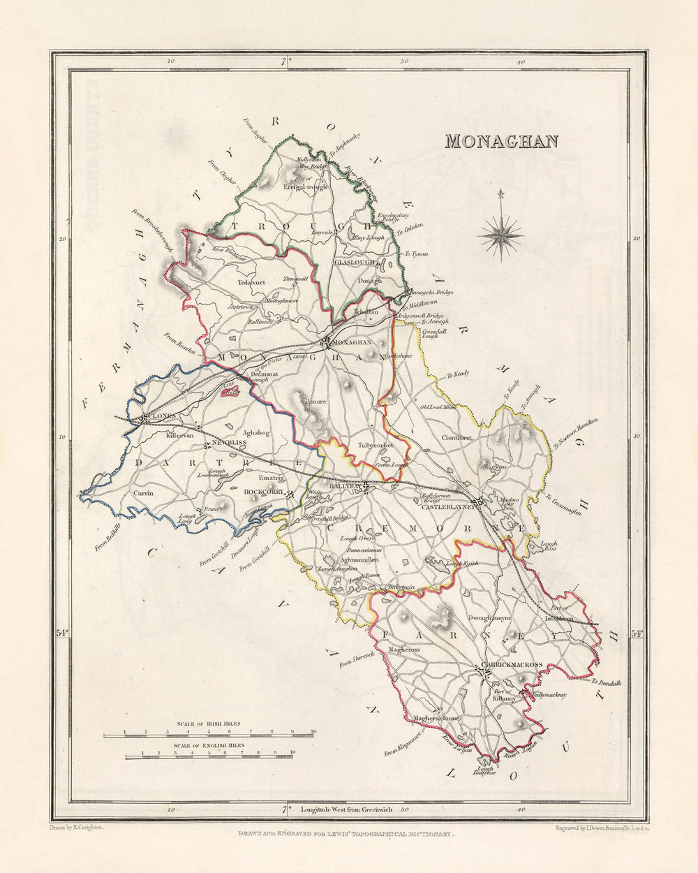 Old Map of County Monaghan by Samuel Lewis, 1844: Castleblayney, Clones, Ballybay, Carrickmacross, Glaslough