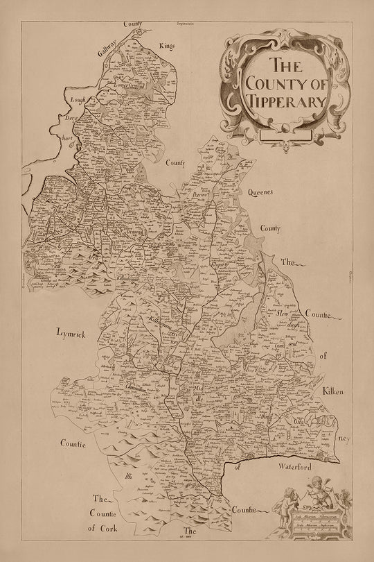 This map of County Tipperary, published in 1685 by Sir William Petty, is a detailed political and physical map that provides a wealth of information about the county. The map is based on the Down Survey of Ireland, which was the first ever detailed land survey on a national scale anywhere in the world. Petty's map shows roads, bridges, cities, places, bishopricks and archbishopricks that were present in the late 17th century in Ireland. Hills, forests, rivers, lakes and loughs are also shown pictorially.