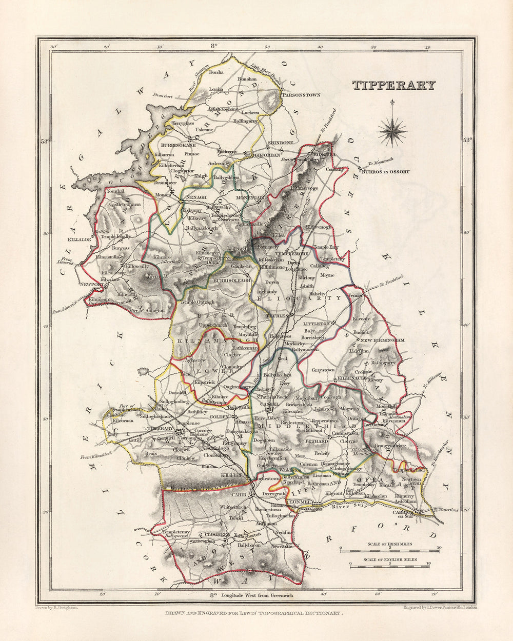 Old Map of County Tipperary by Samuel Lewis, 1844: Clonmel, Nenagh, Thurles, Cashel, Cahir