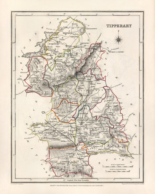 Discover the rich history of County Tipperary with this high-quality reproduction of the "Old Map of Tipperary" by Samuel Lewis, originally published in 1844. This detailed and historically accurate map showcases the county’s mid-19th century boundaries, settlements, and geography in exquisite detail.