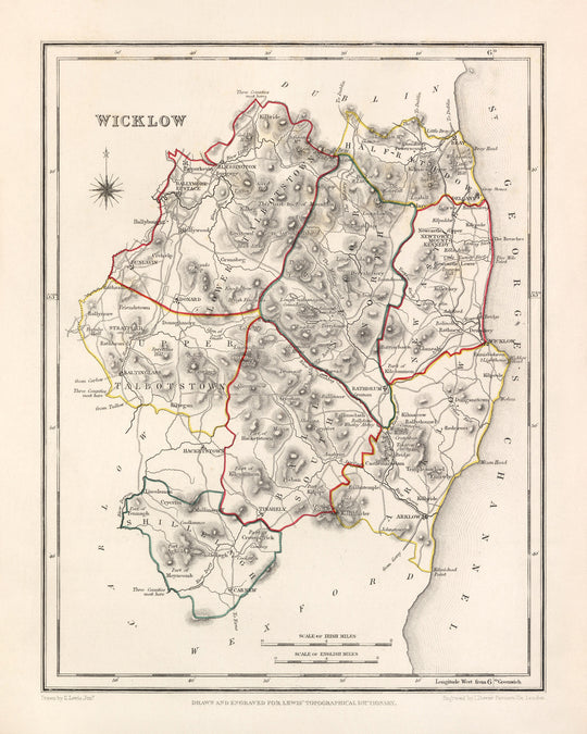 Embrace the allure of the past and immerse yourself in the historical richness of County Wicklow with the "Old Map of Wicklow by Samuel Lewis, 1844." This meticulously crafted map is a testament to the beauty and significance of cartographic artistry, offering a captivating journey through time.