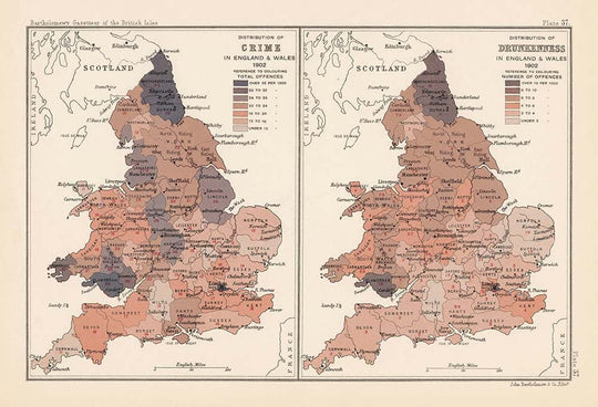 Old Map of Crime & Drunkenness in England and Wales, 1904: Great Britain 1901 Census & Demographics