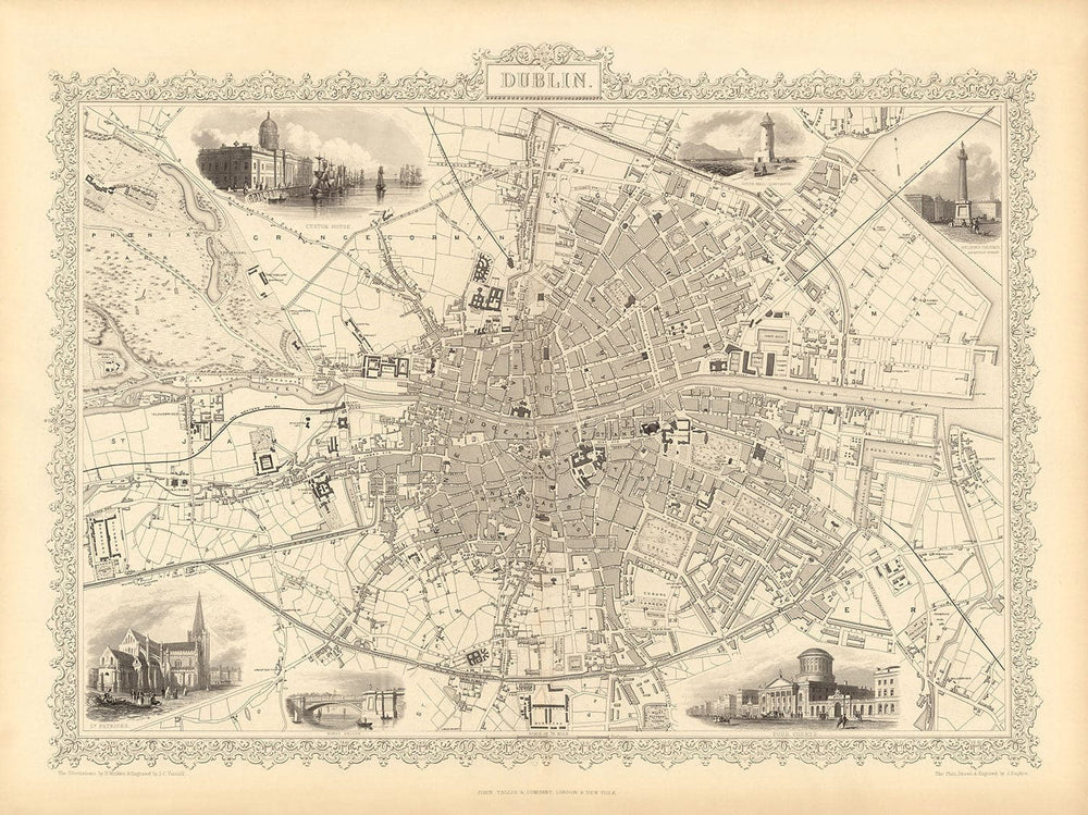 Old Map of Dublin, Ireland, 1851 by Tallis & Rapkin: Central, Temple Bar, Stoneybatter, Docklands, Liffey, Leinster