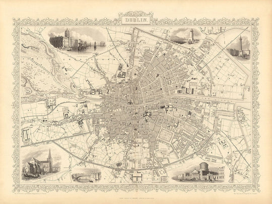 Around the edges of the map are detailed engravings of prominent buildings and landmarks in Dublin, including Custom House, Four Courts and Kings Bridge.