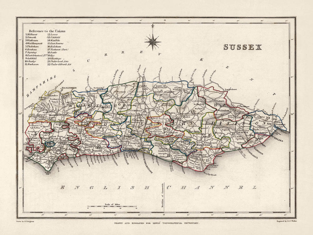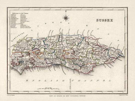 Immerse yourself in history with this remarkable 1844 map of the historical county of Sussex, created by the renowned cartographer Samuel Lewis. This finely detailed representation of East and West Sussex, elegantly reflects the geographical, architectural, and socio-cultural facets of the region during the mid-19th century. As a work of historical and artistic significance, this map embodies the charm and mystique of an era characterized by profound transformation and discovery.