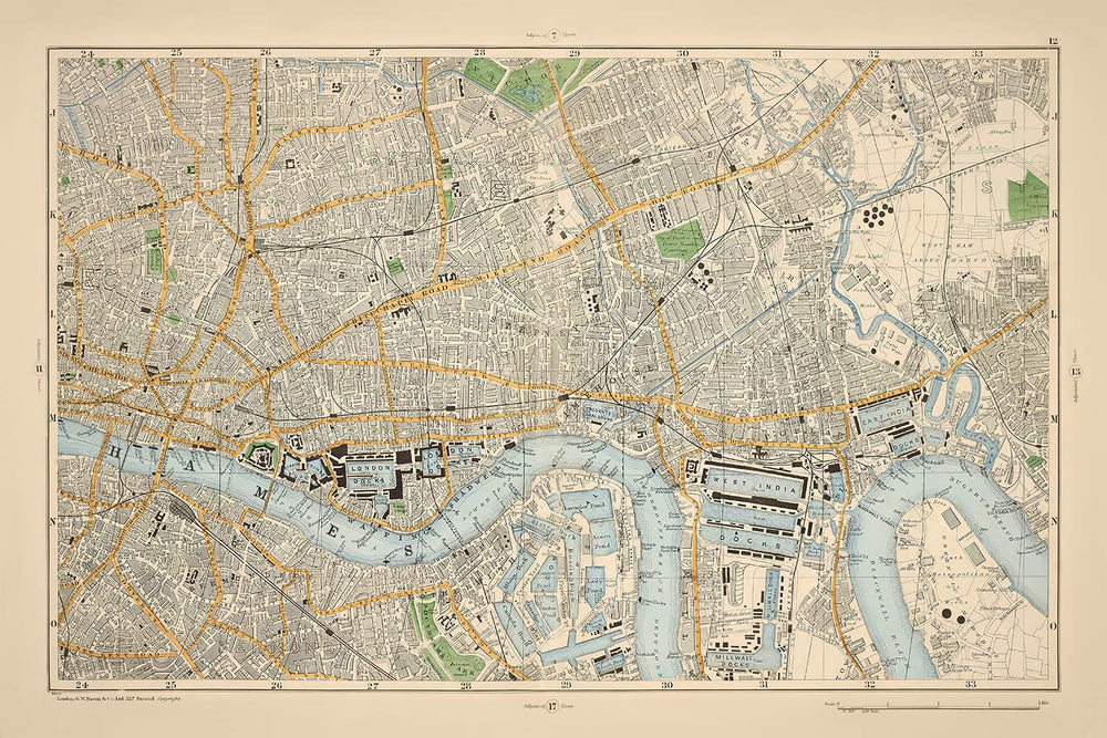Old Map of East-Central London, 1900: Tower of London, The Thames, Isle of Dogs, London Docks, Shoreditch