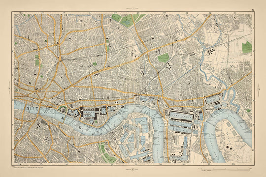 The map prominently features the iconic Thames River, a lifeline weaving through the heart of London. This vital waterway, depicted with precision, connects key areas such as the London Docks and West India Docks, which were once the epicenters of global trade. The map not only illustrates the geographical layout but also tells the story of commerce and industry that fueled the city's growth during the Victorian era.