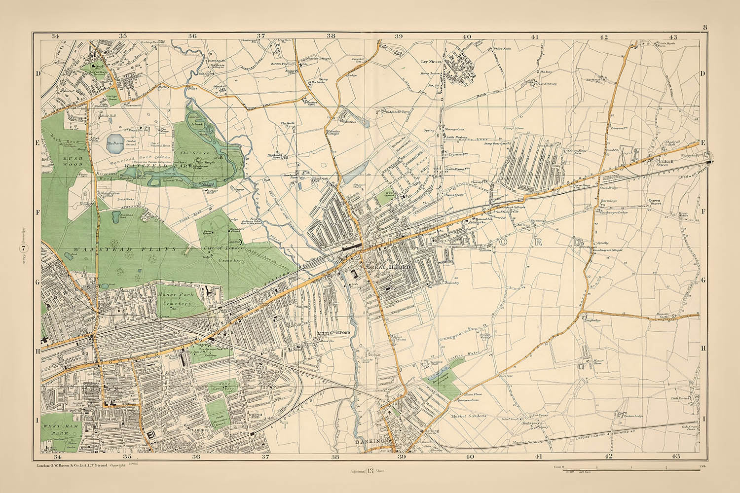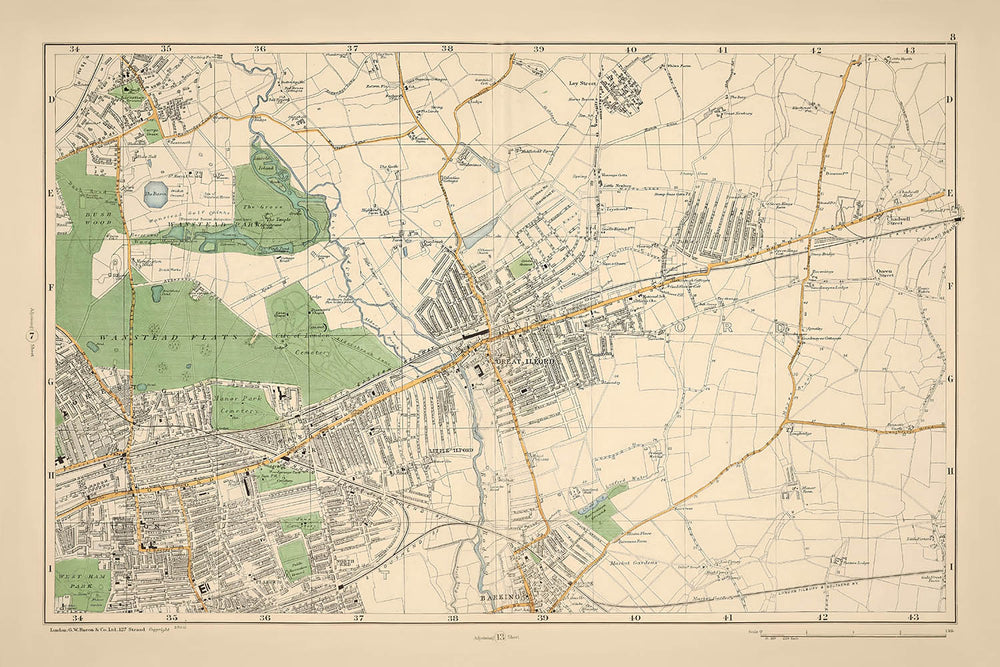 Explore the vibrant neighborhoods of Wanstead, Great Ilford, and Barking, each rich with history and character. Wanstead, known for its lush greenery and stately homes, offers a serene contrast to the bustling streets of Ilford, a burgeoning hub of commerce and culture. Meanwhile, Barking, with its deep roots in trade and industry, stands as a testament to London's enduring spirit of innovation and growth. These areas, beautifully detailed on the map, provide a window into the diverse tapestry of life in East London at the dawn of the 20th century.