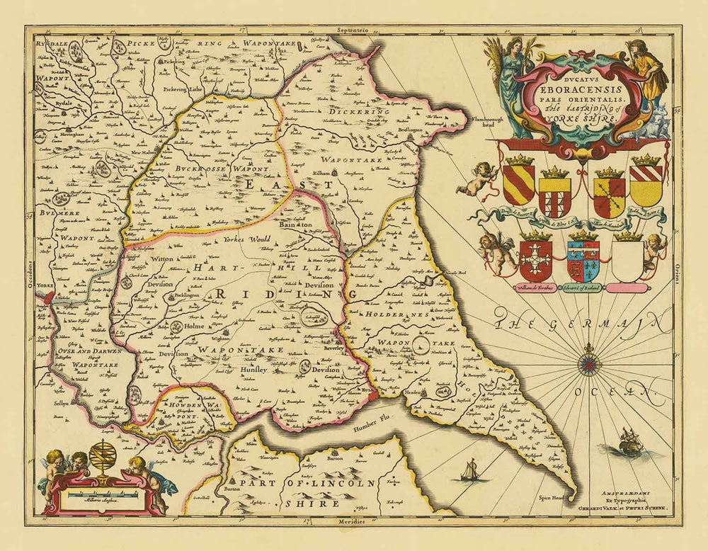 This delightfully handcoloured, detailed and extremely rare map of the East Riding of Yorkshire (now simply East Yorkshire) was originally published in 1690 by Valk & Schenk, a master mapmaking duo that worked out of Amsterdam in the 17th century.