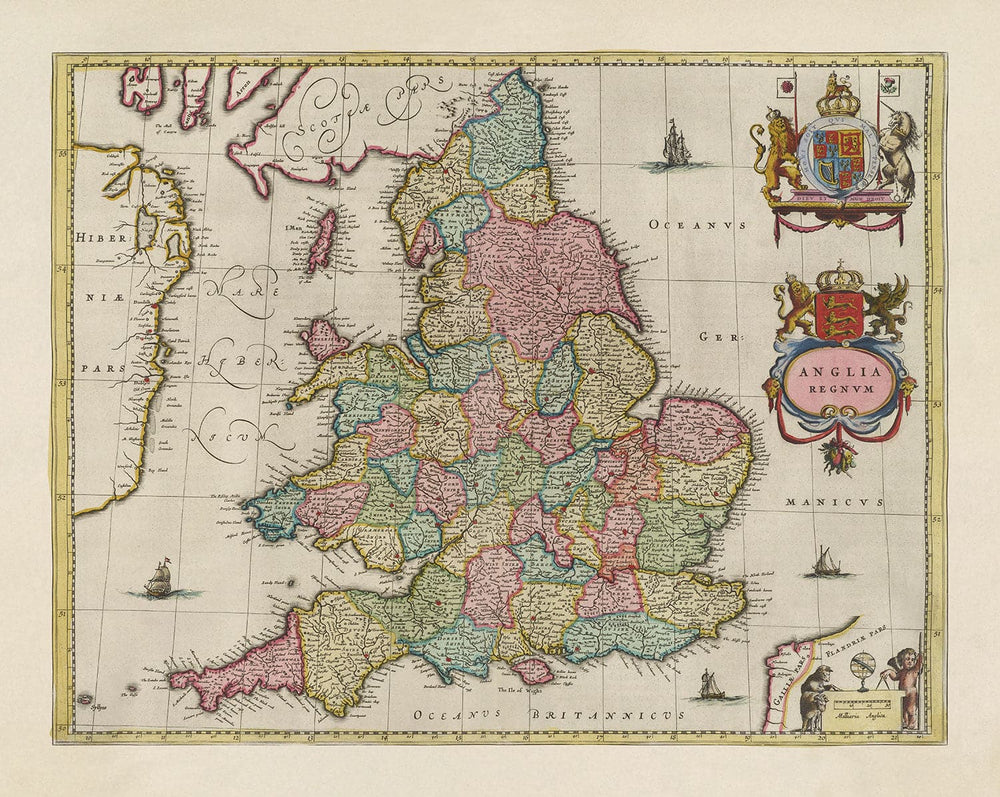 Old Map of England & Wales in 1665 by Joan Blaeu: Rare Chart With Ancient Counties