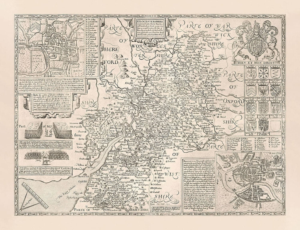 Many of the towns, villages and cities in Gloucestershire are already visible in this map. Back in 1611 Gloucestershire was a bit larger. Today, South Gloucestershire and Bristol have been split off, and some of the northern stretches have become Warwickshire.