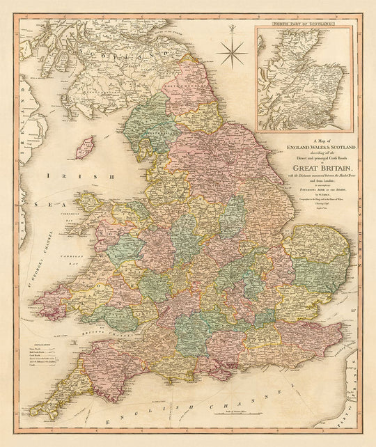 Old Map of Great Britain, 1801 by Faden: England, Wales, Scotland, Roads, Canals, Mail Coach
