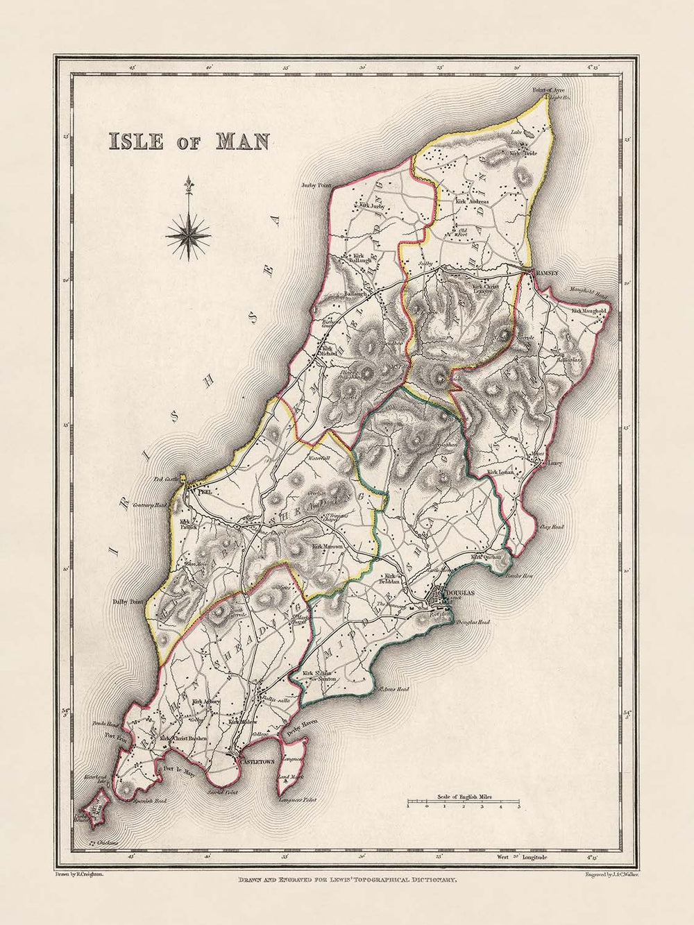 Delve into the past with this 1844 masterpiece by Samuel Lewis, an old map of the Isle of Man, a land laden with rich history and natural beauty. This unique piece of history captures the Isle of Man's intricate geography and settlement patterns in a time before the advent of modern cartography, offering a glimpse into the world of the mid-19th century. Notably, some cities as we know them today might not appear on the map, or if they do, they may be under an earlier name, adding to the charm and intrigue of this beautiful artifact.