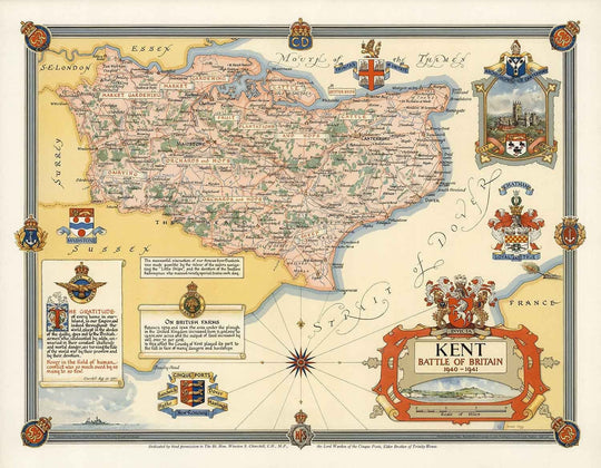 In addition to a detailed map of the county in the middle, Clegg has adorned this map with a number of highly detailed and very attractive illustrations of Kent-related things. These include a detailed view of Canterbury, the white cliffs of Kent and the "Battle of Britain, and what appears to be a destroyer at sea. There's also some other World War 2 bits and a quote by Winston Churchill - the "never in the field of human conflict was so much owed by so many to so few" one.