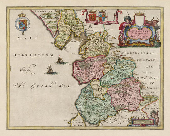 This is an exceedingly rare, old full colour map of Lancashire created by master mapmaker Joan Blaeu from his workshop in Amsterdam and originally published in this Theatrum Orbis Terrarum Sive Atlas Novus in 1654.