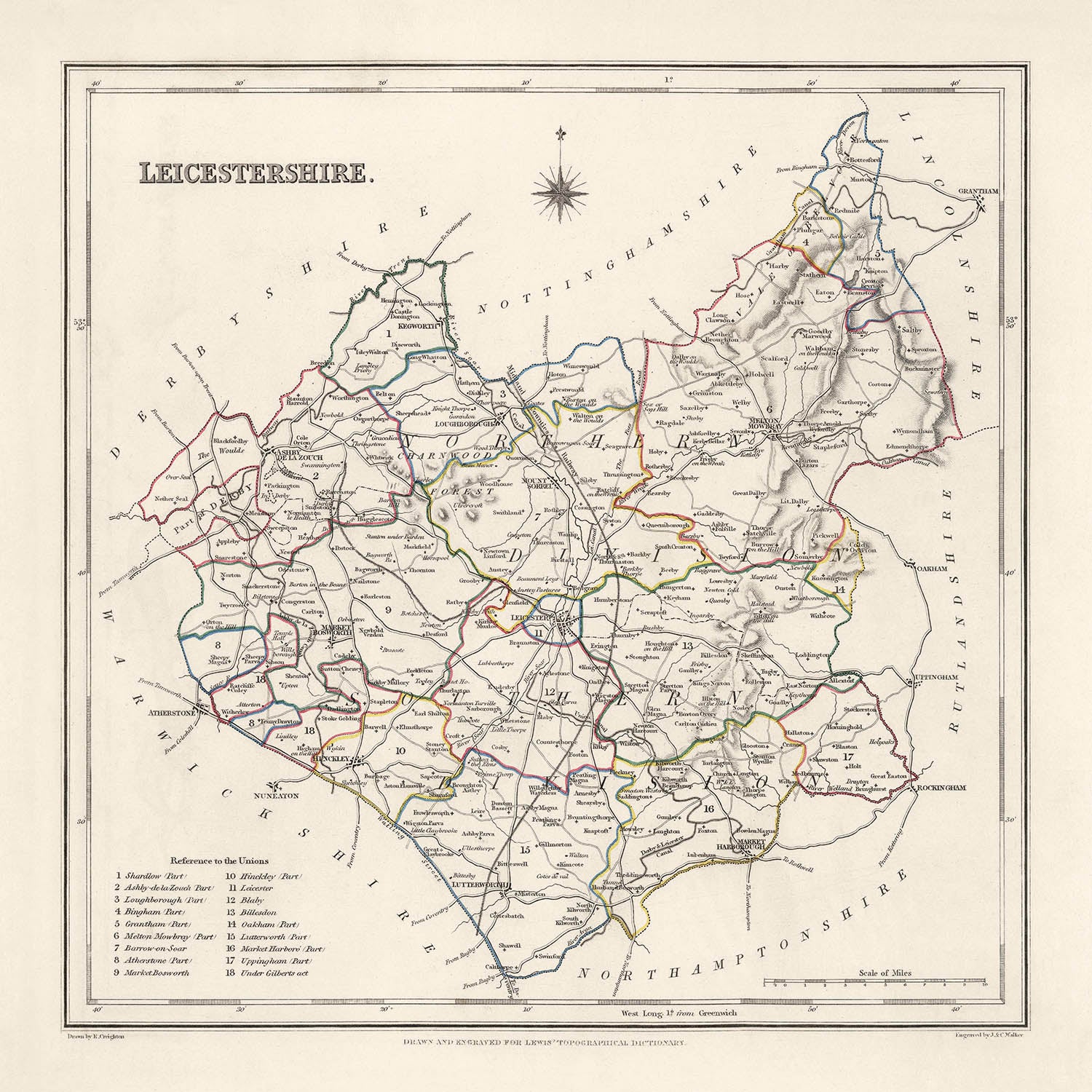 This Old Map of Leicestershire by Samuel Lewis in 1844 showcases the historical boundaries of the county, providing a fascinating glimpse into the past. With its intricate details and exquisite cartographic craftsmanship, this map offers a unique opportunity to explore the region as it stood over 175 years ago.