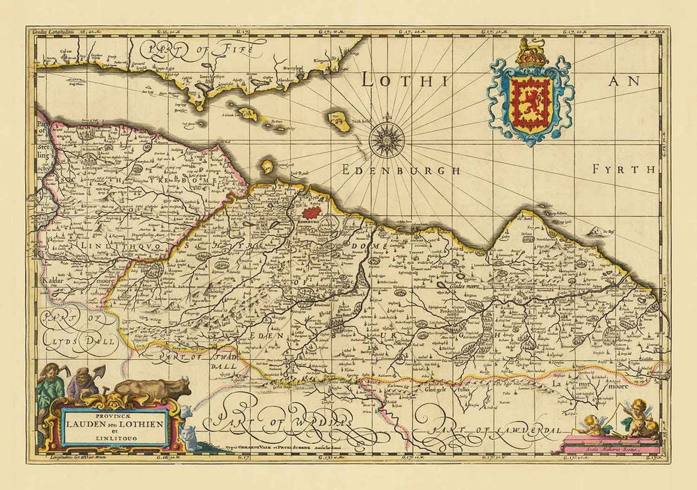 This delightfully handcoloured, detailed and extremely rare map of the ancient region of Edinburgh and Lothian was originally published in 1690 by Valk & Schenk, a master mapmaking duo that worked out of Amsterdam in the 17th century.