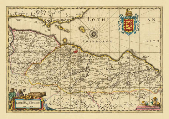 The top right corner of the map shows a wonderfully illuminated Scotland coat of arms. The firth of Forth dominates the top portion of the map and Inverkeithing just over the river can be seen.