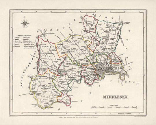 This Old Map of Middlesex by Samuel Lewis in 1844 is a captivating piece of history that offers a glimpse into the past. With its intricate details and exquisite craftsmanship, this map is a true work of art. It provides a unique opportunity to explore the County of Middlesex during the mid-19th century.