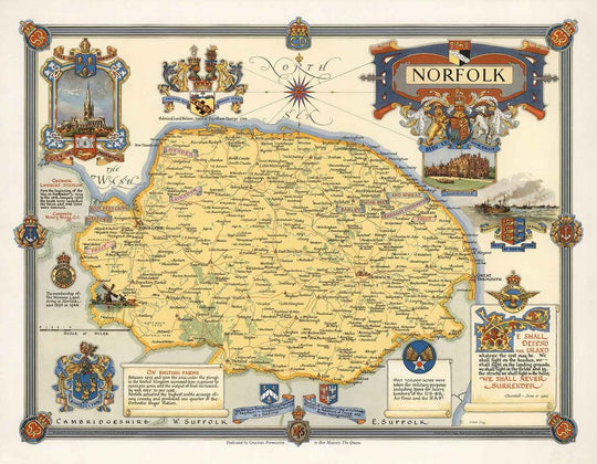 In addition to a detailed map of the county in the middle, Clegg has adorned this map with a number of highly detailed and very attractive illustrations of notable Norfolk landmarks. These include Sandringham, the city of Norwich, and a view of boats in Yarmouth. There's also a few World War 2 related bits, including a rather famous quote by Winston Churchill - the one about fighting on the beaches, fields, streets and never surrendering!