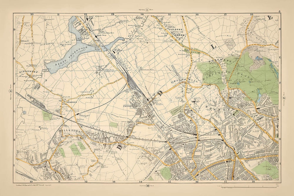 The map highlights significant neighborhoods such as Kingsbury, Willesden, and the picturesque Hampstead, each offering a unique window into the past. Kingsbury, with its historical roots, stands alongside the more urbanized Willesden, showcasing the diversity of development during this era. The inclusion of Golders Green and Cricklewood further emphasizes the rapid expansion and the blending of rural and urban landscapes that characterized this period in London's history.