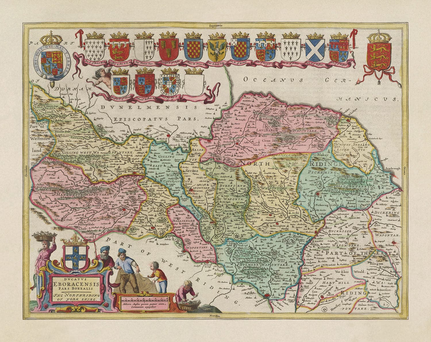 Many of the towns, villages and cities in North Yorkshire are already visible in this ancient map, including Middleborough, York, Whitby and Scarborough.