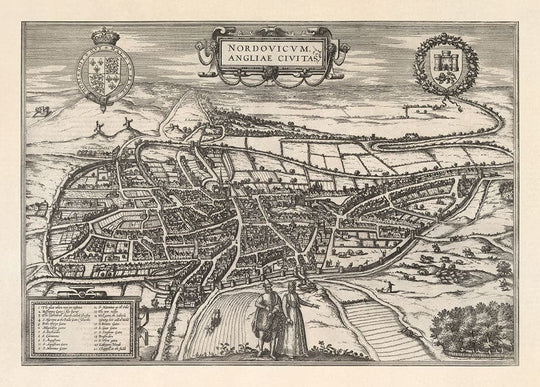 Old Map of Norwich, East Anglia 1581 by Georg Braun, Civitates Orbis Terrarum: Castle, City Walls