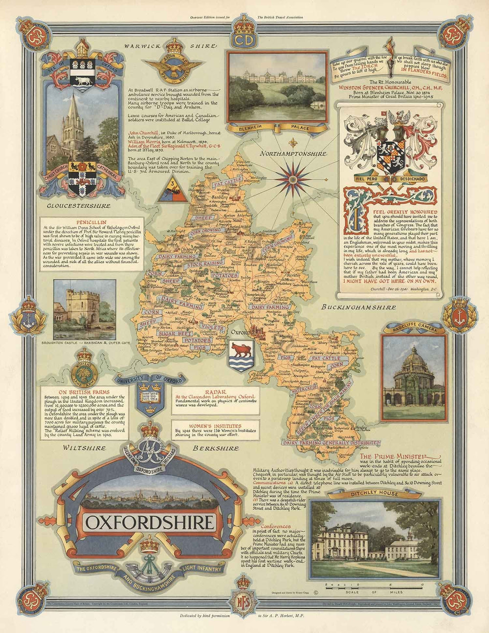 A charming post-World War 2 themed map of Oxfordshire, published in 1947 by one of the top mapmakers of the 1900s, Ernest Clegg.