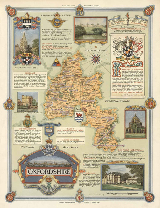 In addition to a detailed map of the county in the middle, Clegg has adorned this map with a number of highly detailed and very attractive illustrations of notable Oxfordshire landmarks. These include Blenheim Palace, Radcliffe Camera, Ditchley Park, and Christchurch Cathedral. There's also a quote by Winston Churchill, a few World War 2 related things, Oxford University's famous inventions... and more!