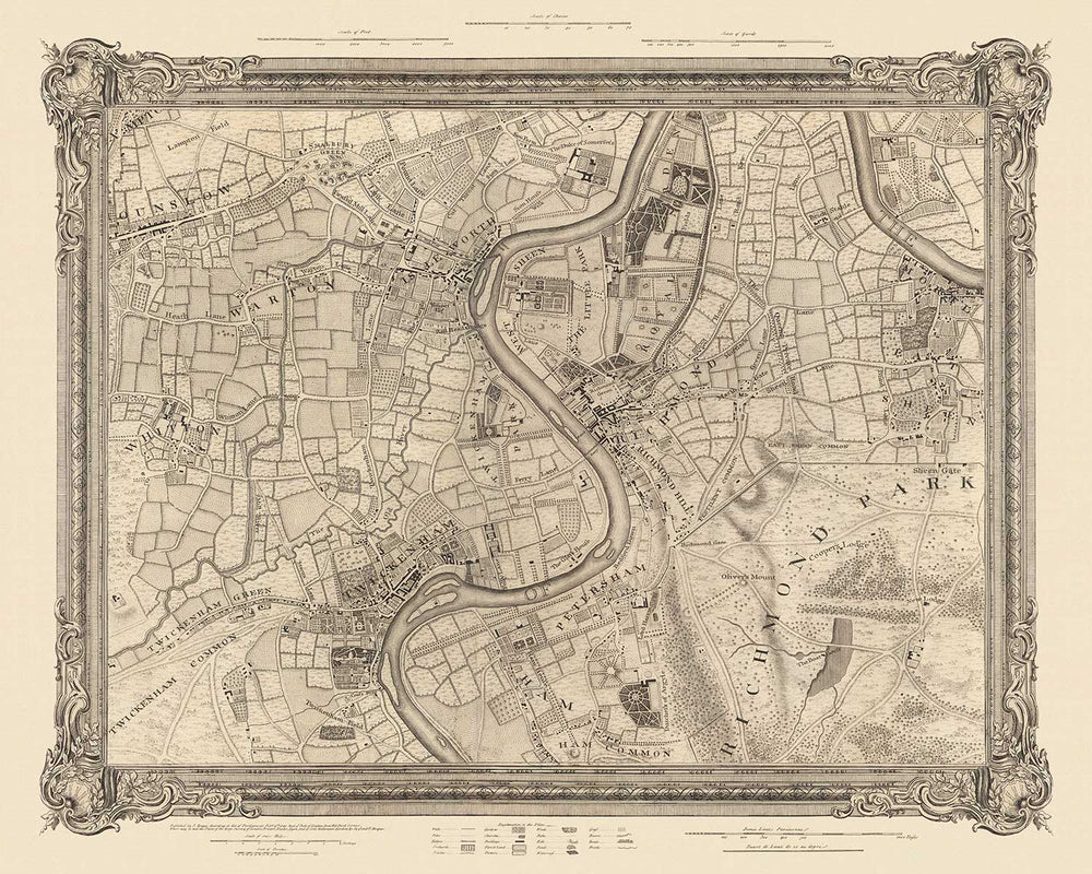 Published almost 300 years ago by master mapmaker John Rocque, this is the first detailed map of West London. It was originally published in 1746, following a highly accurate survey of London and its suburbs starting in 1740. It is a beautiful, highly detailed and extremely rare old map.