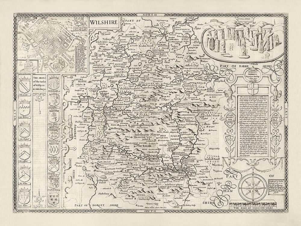 Old Map of Wiltshire in 1611 by John Speed: Salisbury, Stonehenge, Swindon, Trowbridge
