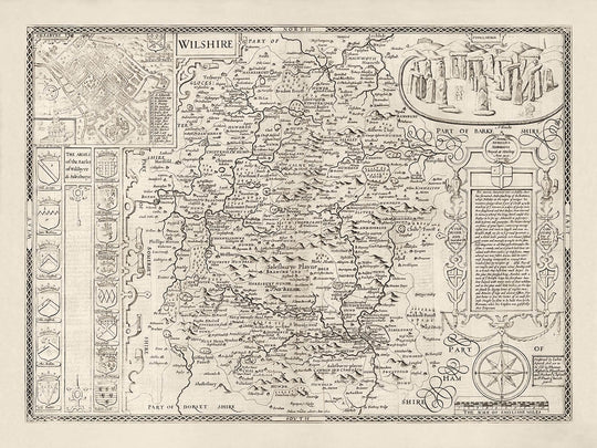 This old, monochrome and wonderful map shows the ancient county of Wiltshire as it was in 1611. It was created by John Speed and engraved by Jodocus Hondius, and originally published in Speed's "The Theatre of the Empire of Great Britaine".