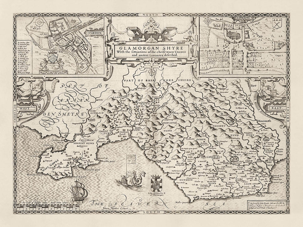 Old Monochrome Map of Glamorgan, Wales, 1611 by John Speed: Cardiff, Swansea, Bridgend, Port Talbot, Barry