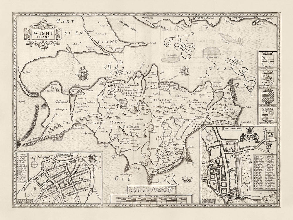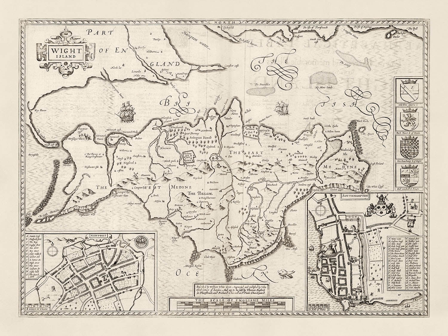 Old Monochrome Map of Isle of Wight, 1611 by John Speed: Newport, Ride, Cowes, Sandown, Shanklin, Southampton