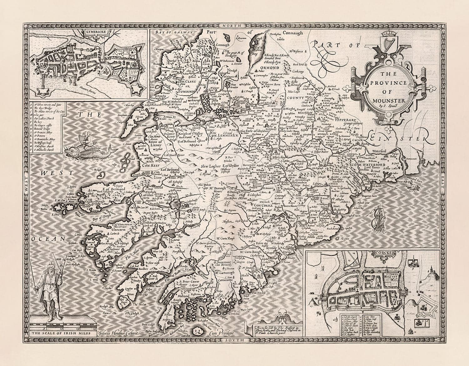 Old Monochrome Map of Munster, Ireland in 1611 by John Speed: County Cork, Clare, Kerry, Limerick, Tipperary, Waterford, Dingle