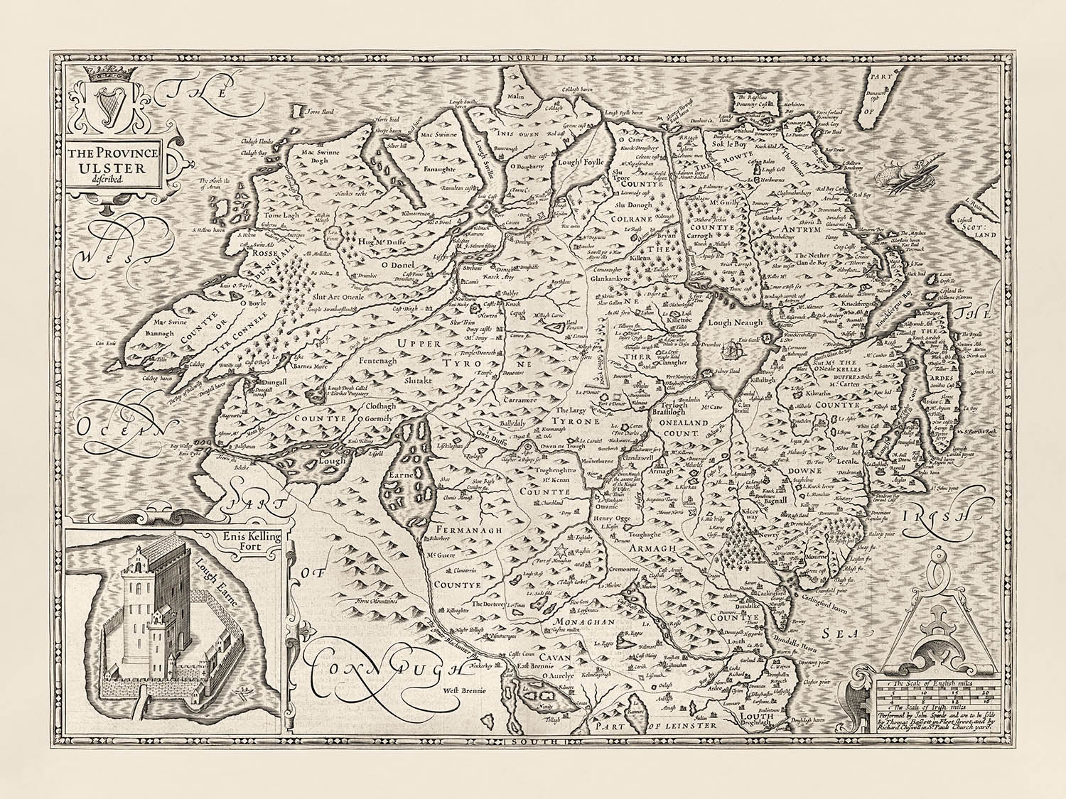 Old Monochrome Map of Ulster, Northern Ireland in 1611 by John Speed: Belfast, Derry (not Londonderry), County Antrim & Down