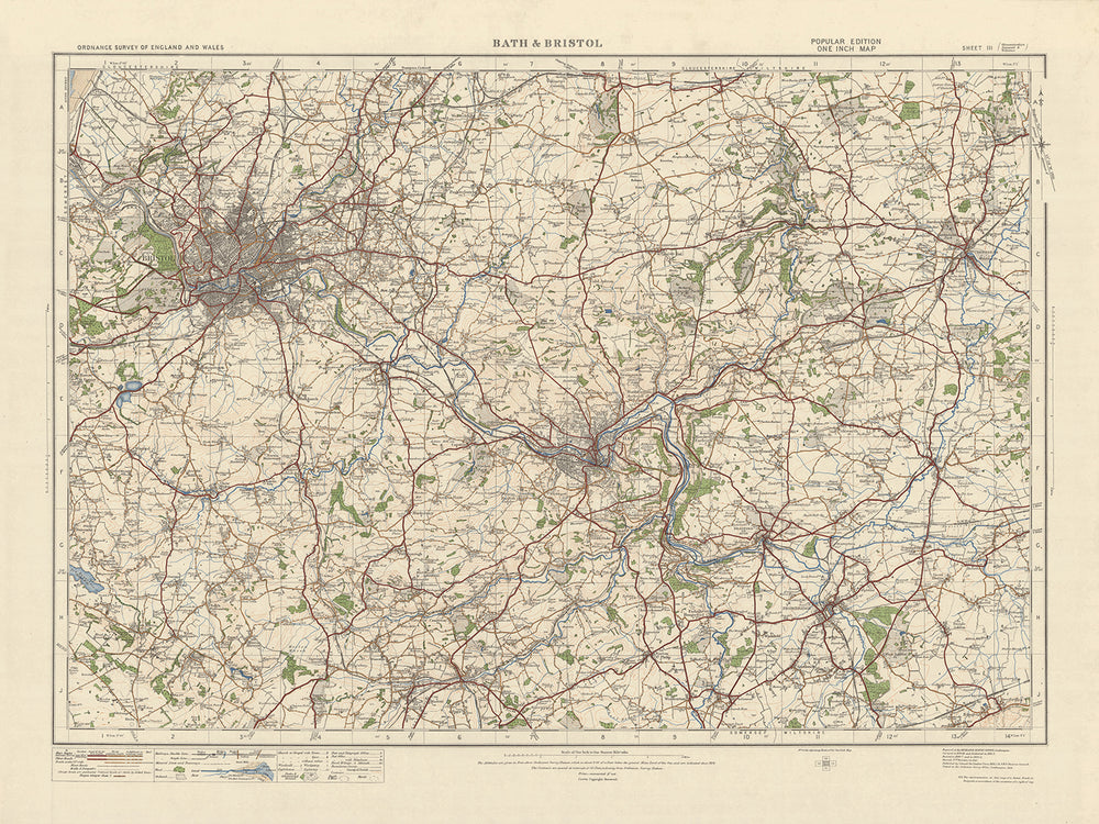 Embrace the allure of the past with this meticulously detailed old Ordnance Survey map, Sheet 111 - Bath & Bristol, 1925. Discover the historical charm of Bath and Bristol, explore the surrounding towns, and immerse yourself in the natural beauty of the Cotswolds AONB.