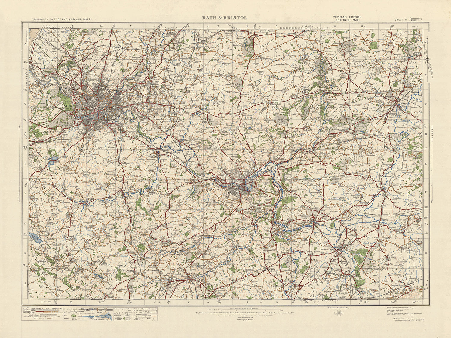 This old Ordnance Survey map, Sheet 111 - Bath & Bristol, was published in 1925 as part of the One-inch "Popular" edition for England and Wales. The map showcases the historic county of Somerset, where the notable cities of Bath and Bristol are located. In addition to these prominent cities, the map also includes the towns of Chippenham, Trowbridge, Corsham, Melksham, and the picturesque Cotswolds Area of Outstanding Natural Beauty (AONB).