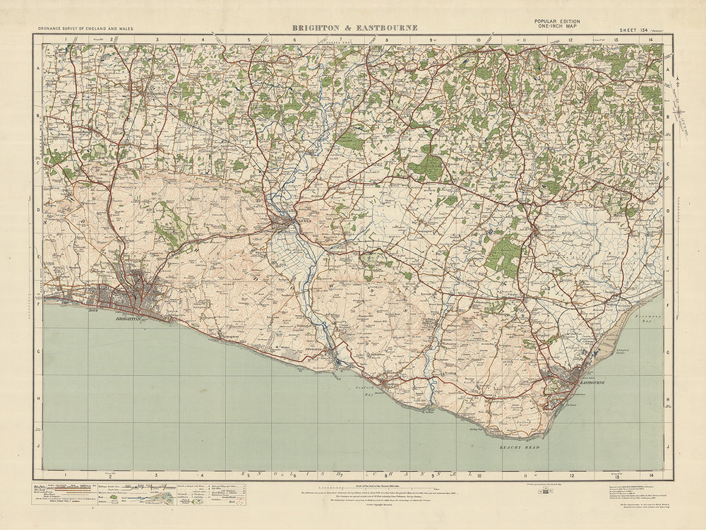 This old map, titled "Sheet 134 - Brighton & Eastbourne," is a part of the Ordnance Survey's One-inch "Popular" edition of England and Wales, published in 1925. The map showcases the towns of Brighton and Eastbourne, along with several other notable settlements and features in the surrounding area.